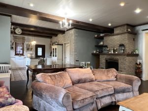Стены первого этажа в 2 кирпича с утеплением. Второй этаж сделан из крупного бревна диаметром до 32 см. Требуются незначительные доработки.
