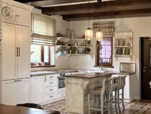 1 этаж: прихожая с гардеробной, большая гостевая спальня, санузел с мозаичной душевой, и огромная кухня столовая гостиная площадью 57 м2 с окнами на 3 стороны света, с камином и с выходом в лаунж - веранду с зоной барбекю. Здесь много света и воздуха. Кроме того, на первом этаже есть постирочная, топочная и гараж.