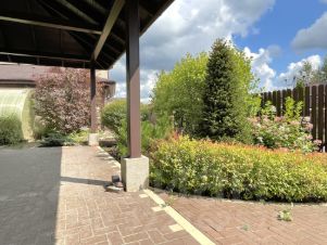 На участке установлена система полива. Ландшафтный дизайн с прогулочными дорожками, взрослыми хвойными и лиственными деревьями и декоративными кустарниками. Установлена гостевая парковка под навесом на два машиноместа.