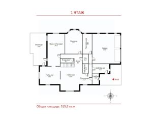 1 этаж: котельная (Buderus), постирочная, гараж на 2 м/м, гардеробная, гостиная с камином и вторым светом, зона отдыха, кухня-столовая с выходом на закрытую веранду, хоз.комната, гостевая спальня, с/у;