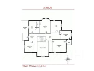 2 этаж: хозяйская спальня с ванной комнатой и просторной террасой, спальня с гардеробной, с/у, спальня (кабинет) с балконом, спальня;