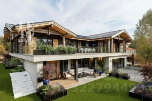 Особенностью проекта является величественное архитектурное решение, которое сочетает в себе мощь и природу. А также важно отметить, что Первый этаж дома выполнен из сухостойной сосны КЕЛО, который является самым экологичным и долговечным материалом для домов.