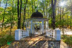 Беседки, освещение, красивые деревья создают атмосферу парка.