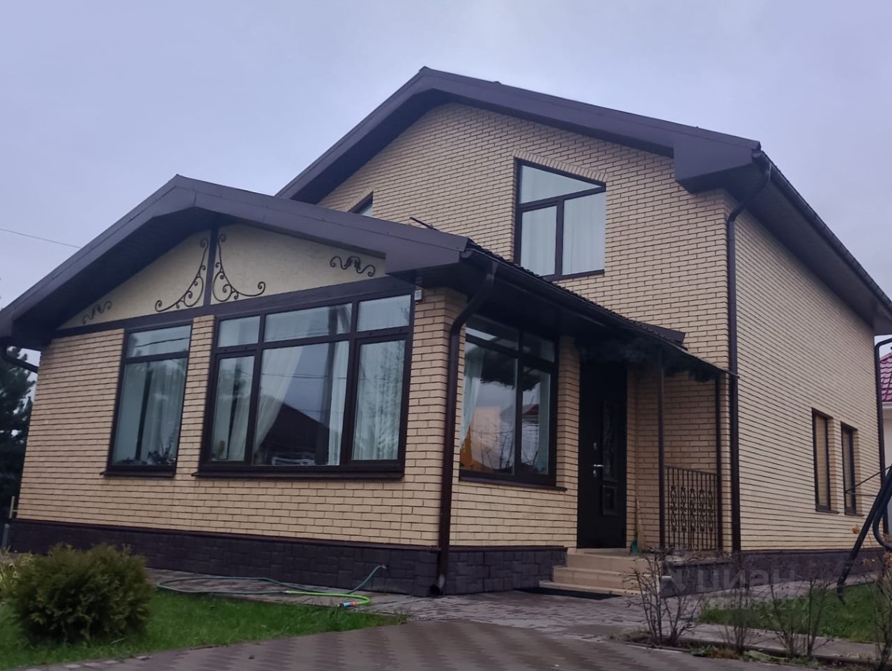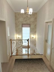Внешняя и внутренняя отделка коттеджа выполнены из высококачественных материалов. Кровля металлочерепица. Кованая лестница, кованые перила на входе и другие кованые элементы.