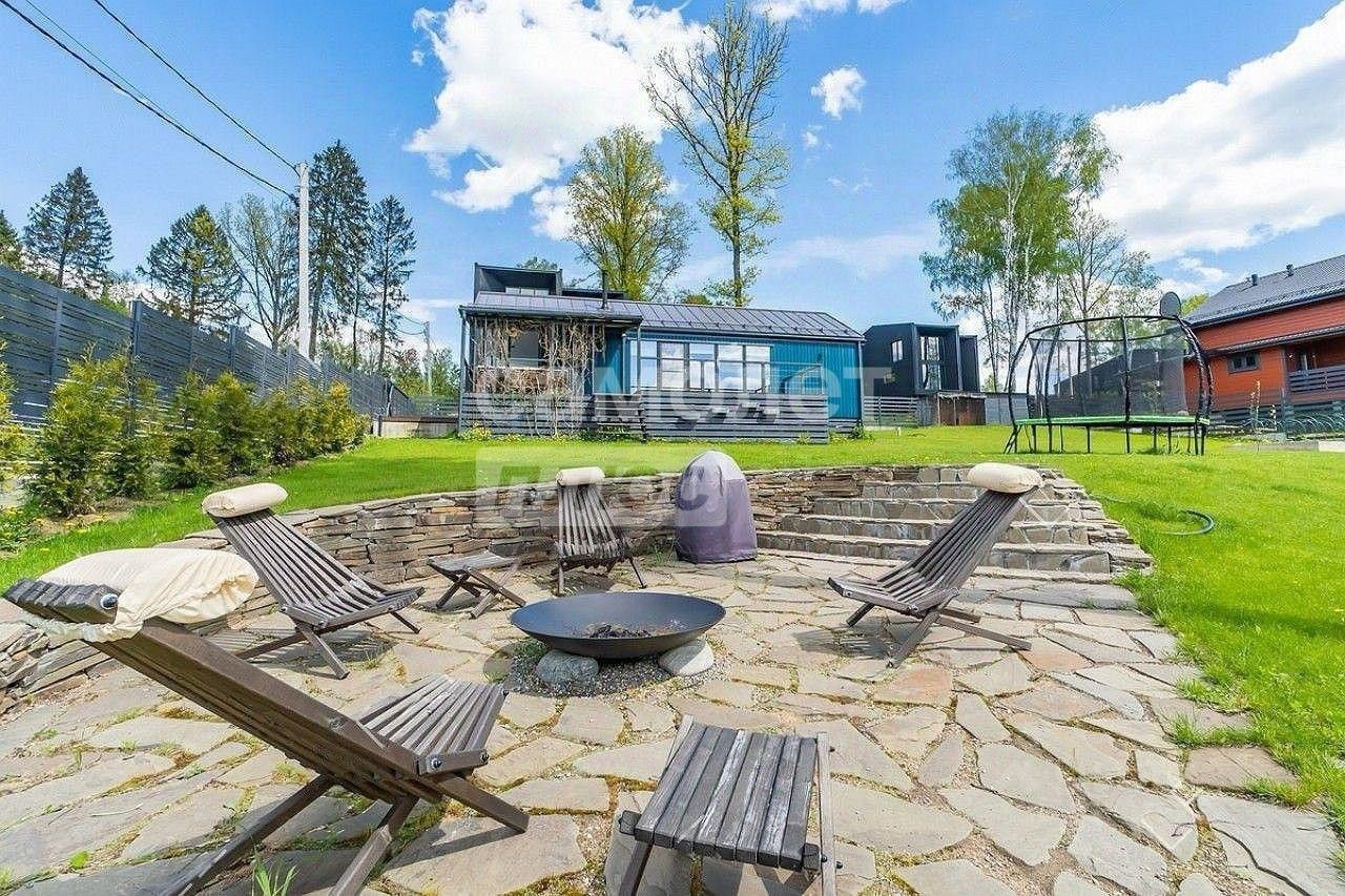 Участок двухуровневый. Уже частично выполнен ландшафтный дизайн, а также выполнена двухуровневая планировка участка, дренаж и ливневая канализация и заложены коммуникации под уличное освещение и полив. Посажены лесные, декоративные и плодовые деревья. На участке оборудованы: детская площадка по индивидуальному проекту, оформлена зона кострища, зона огорода и залит фундамент для теплицы. Установлены 2 хозяйственных блока, собачий вольер с будкой, организована щебеночная парковка площадью 30 м2 на 3 автомобиля. По периметру участок огорожен забором на фундаменте с откатными автоматическими воротами. Планировка участка предполагает постройку второго дома с пятном застройки площадью 100 м2 (все коммуникации выведены для строительства).