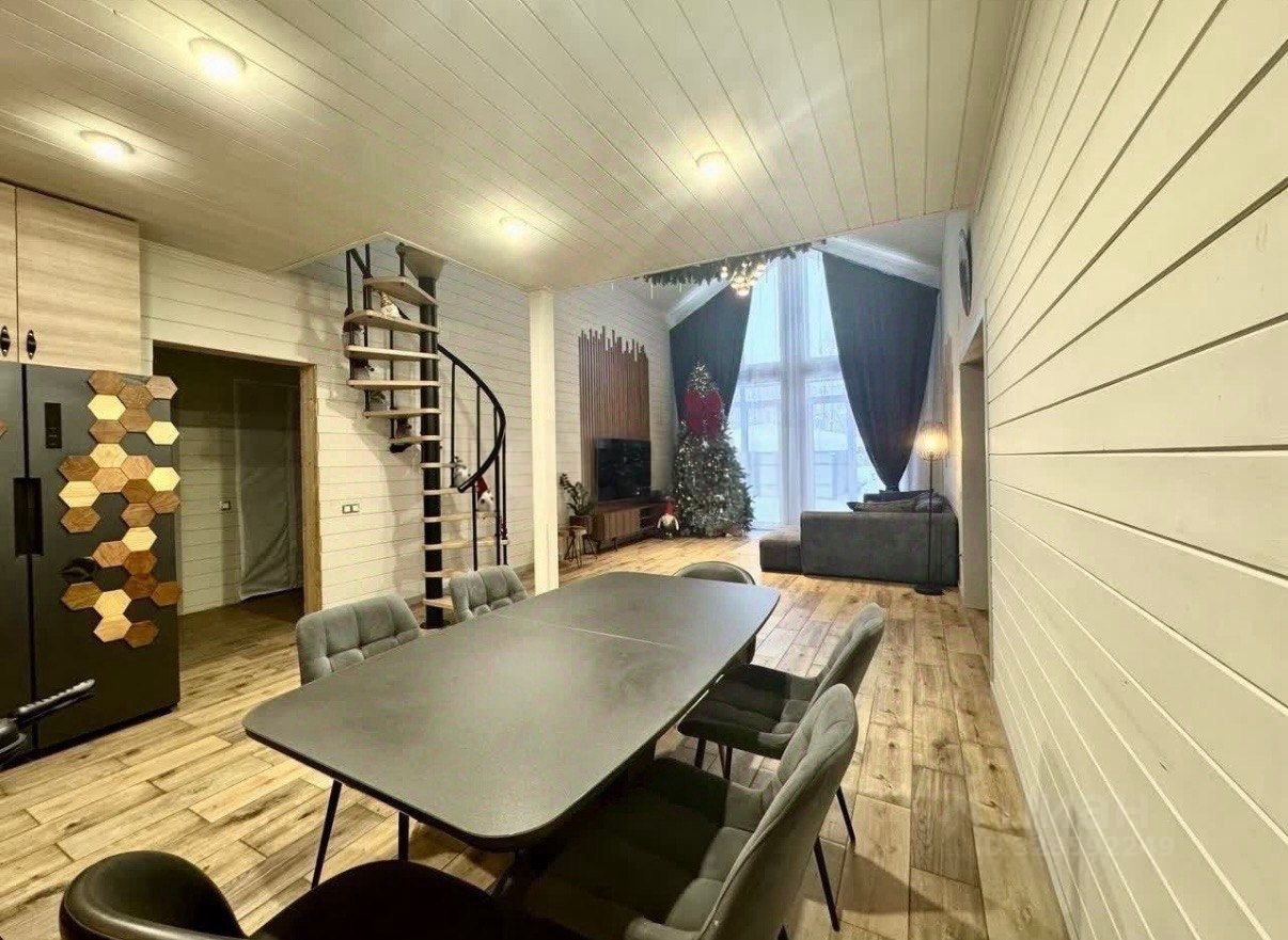- Красивая винтовая новая лестница, ведущая в комнату над кухней (20 м²).
