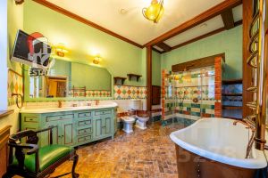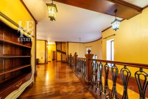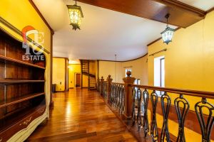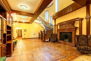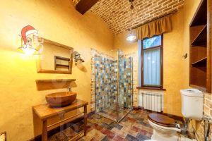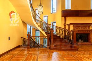 Интерьер: Оформлен в уютном стиле английского кантри. Теплая цветовая гамма, деревянные балки, паркет и камин создают атмосферу респектабельного и неспешного загородного быта.