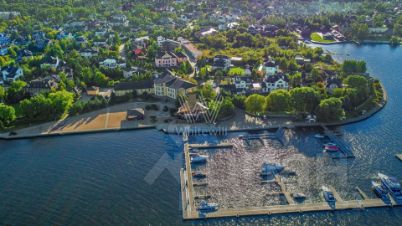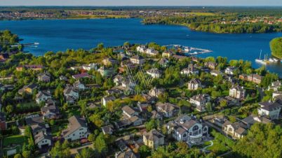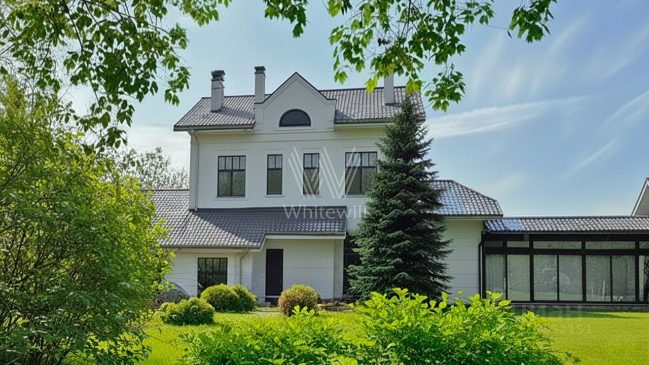 Золотой город. Загородный особняк площадью 1300 м² на участке 60 соток расположен на первой береговой линии реки Клязьма. Фасад, выполненный в неоклассическом стиле, облицован кремовой штукатуркой, дополнен элегантной рустовкой и замковым камнем. Панорамные окна открывают захватывающие виды на водную гладь и наполняют внутренние пространства естественным светом.
