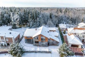Дом расположен в одной из самых приватных частей поселка, рядом с прудом и примыкает к лесу, благодаря чему, из окон открывается шикарный вид на лесную чащу . Отлично спланированное внутреннее пространство позволяет разграничить общую семейную жизнь и приватные зоны.