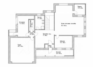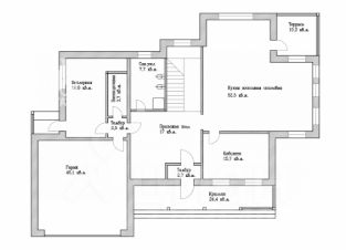 Первый этаж: крыльцо, тамбур, прихожая, гараж, тамбур, бойлерная, крыльцо, постирочная, 2 санузла, кухня-гостинная-столовая, терраса, кабинет;
