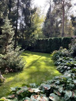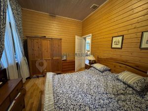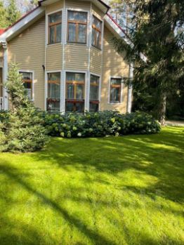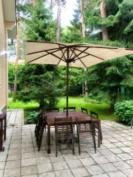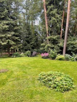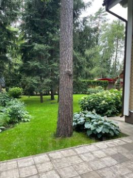 Дом расположен на ухоженном участке площадью 11 соток. Территория радует обилием зелени: здесь растут ели и вековые сосны. Оборудована зона барбекю — идеальное место для отдыха на свежем воздухе.