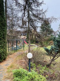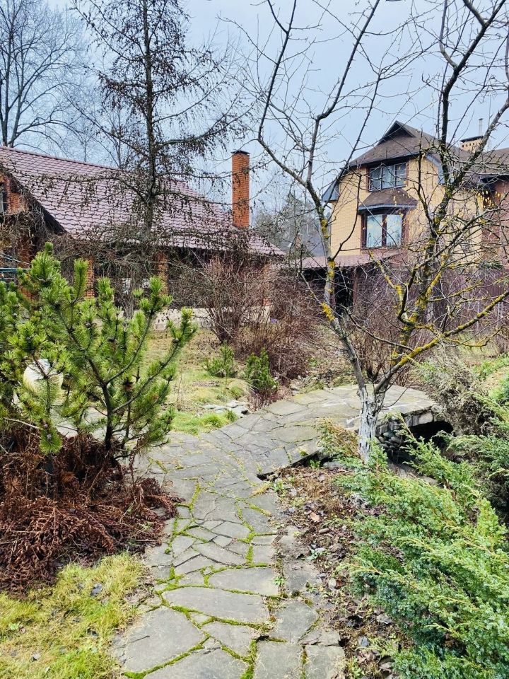 Участок огорожен , ухожен : газон , дорожки , хвойные деревья , береза , липа , кустарники , площадка для машины на бетонном основании , декоративный сухой ручей с мостиком