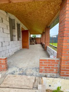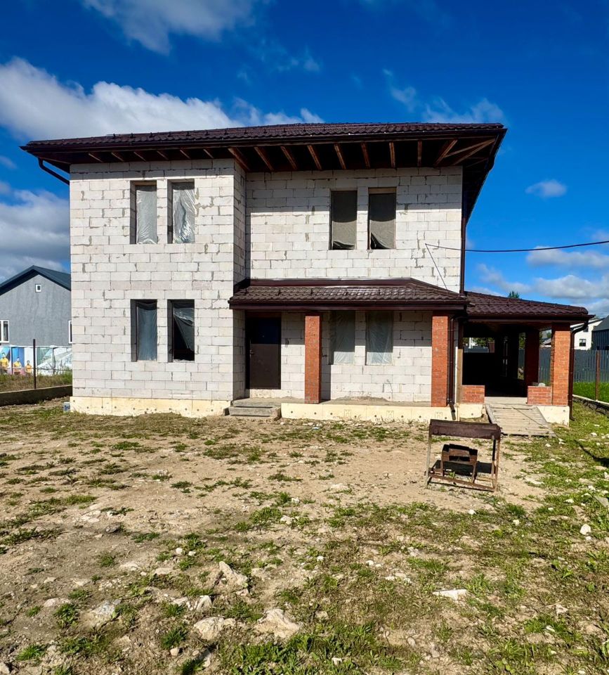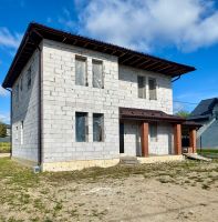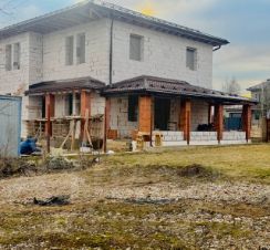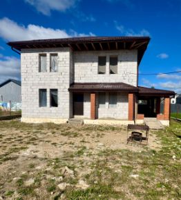 Дом 205 м2, первый этаж 92 м2 включает в себя гостиную, холл, спальня, санузел, котельная, кабинет, второй этаж 87 м2 включает в себя четыре спальни, холл, санузел, веранда 25 м2, при черновой отделке высота потолков на первом этаже 3,3 м, на втором этаже 2,8 м.