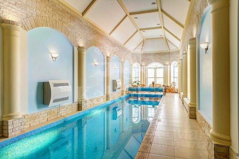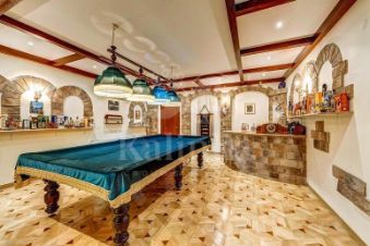 В доме 6 спален, 2 кабинета, гостиная с камином, 2 кухни (из одной- выход на террасу), столовая, библиотека с домашним кинозалом и камином, зимний сад, бассейн 12,5 м с сауной и отдельным выходом во двор, бильярдная, тренажерный зал, мастерская, бойлерная, 5 санузлов, 5 душевых кабин, помещения для хранения вещей и продуктов. А также 4 балкона и 2 террасы.