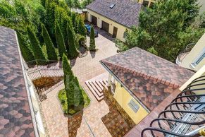 Во дворе отдельно стоящий дом с гаражом на 3 машиноместа, с помещением для охраны и складскими помещениями площадью 180 м2. Гриль с подводом воды рядом с террасой.