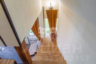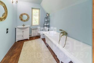 На втором этаже, на который ведет красивая лестница, оборудована большая мастер спальня, детская и кабинет . В совмещенном санузле расположена ванна.