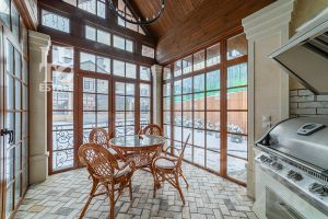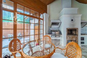 На участке также предусмотрена зона барбекю, оснащенная печью, выполненной гильдией печников, и профессиональной системой вытяжки. Кроме того, здесь располагается просторная кладовая для хранения садового инвентаря, что обеспечивает дополнительный комфорт и удобство в организации досуга на свежем воздухе.