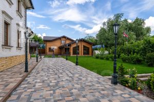На участке также выполнен дренаж и установлен автополив, что обеспечивает легкий уход за зелеными насаждениями. Уличные светильники, изготовленные на Ленинградском металлическом заводе, гармонично дополняют ландшафт.