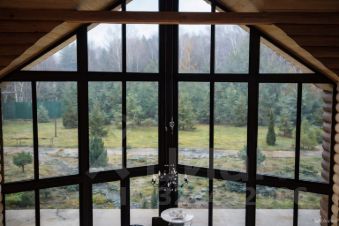 Дом площадью 300 кв.м.: 2 этажа, гостиная с камином, со вторым светом и панорамным остеклением, откуда открывается вид на участок и лес.