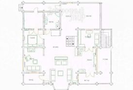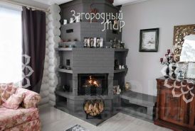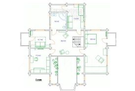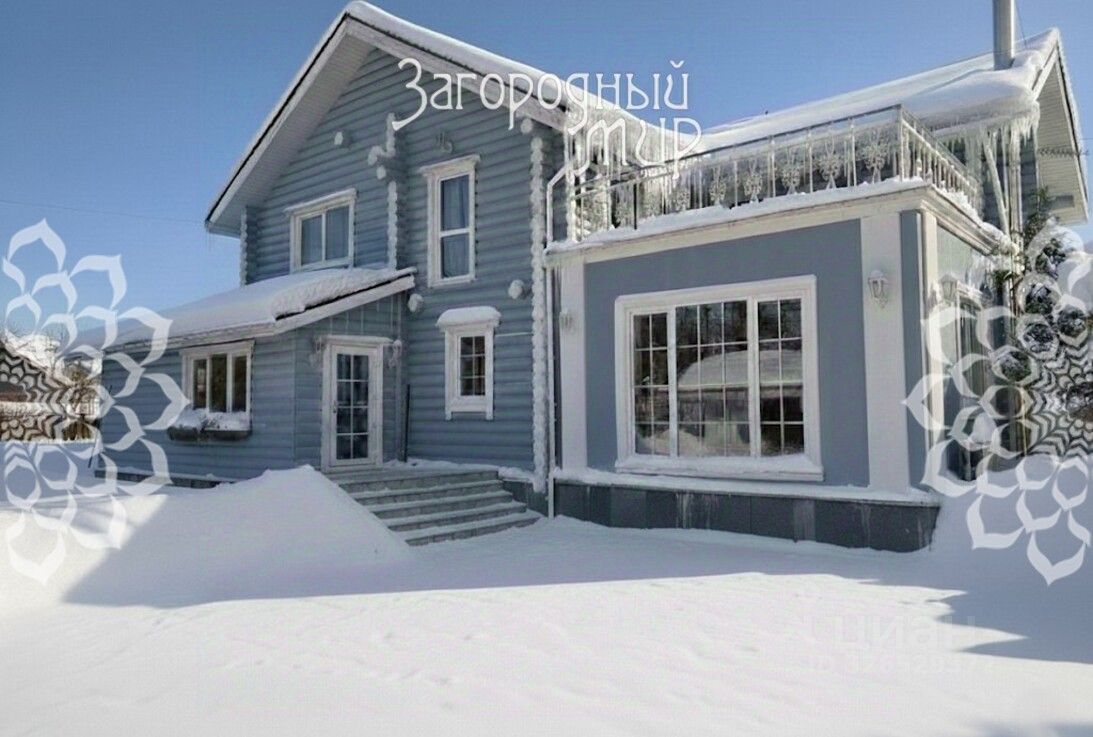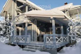 Дом в 2 этажа из оцилиндрованного бревна с монолитным цокольным подвалом, фактически — дополнительным этажом, снаружи оштукатурен и покрашен. Общая площадь дома 407 кв. м, по документам — 390 кв. м. Пристроена зона кухни из керамического блока. Мягкая кровля для хорошей звукоизоляции. Качественные пластиковые стеклопакеты REHAU.