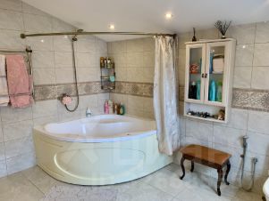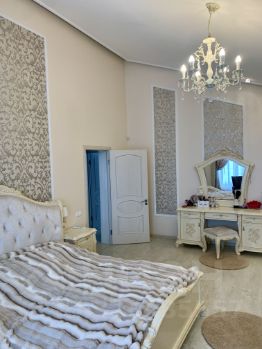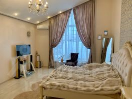 Просторная кухня-гостиная (56 кв.м)- итальянский кухонный гарнитур со встроенной бытовой техникой, с двойным холодильником, отделан патиной с рисунком Versace, пол - керамическая плитка 60x60 с водяным подогревом, гостевая спальня 17,5 кв.м., сан.узел с душем, подсобное помещение под лестницей с отдельной дверью, выход на просторную закрытую веранду-пол с подогревом, окна почти до пола. С веранды выход к зоне барбекю.