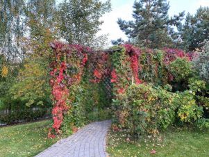 Территория вокруг дома практически целиком отдана под озеленение: деревья-крупномеры (кедры, сосны, ели ценных пород, огромные липы), плодовые деревья (калина, рябина, сирень, черемуха, вишня), много видов кустарников, цветущих поочередно в разное время года, сад из нескольких видов гортензий, пионов и рододендронов, чудесная крытая аллея, увитая девичьим виноградом - и это далеко не полный список. А большой размер участка - 60 соток - позволил также разместить на нем огромный газон для отдыха.