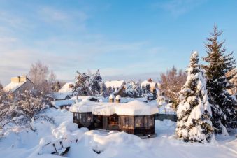 Бассейн 80 кубов: Он вынесен в отдельно стоящее здание. Это позволяет полностью разделить банные процедуры и плавание — у каждого вида отдыха своя атмосфера.
