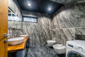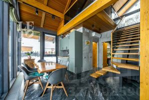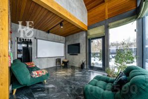 Помимо основного дома на участке расположен гостевой дом-баня в стиле фахверк, с большими панорамными окнами в пол, полностью оборудованный всем необходимым для комфортного отдыха и приема гостей.