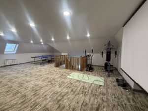 3 этаж: мансарда с высокими потолками - где оборудован кинотеатр, установлен теннисный стол и тренажеры.