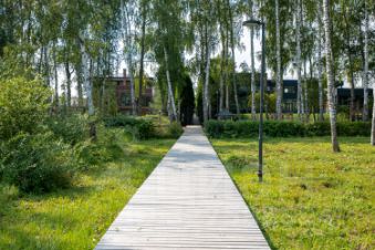 На самом берегу разместилась шикарная лесная прогулочная зона с детскими площадками, яхт-клубом и зоной для купания.