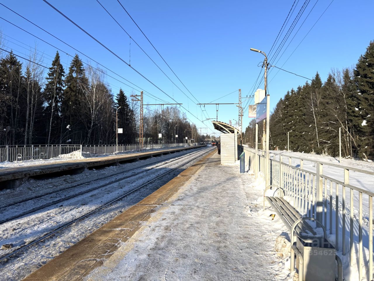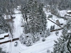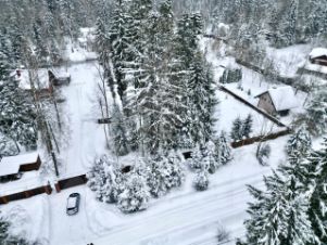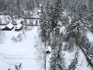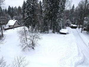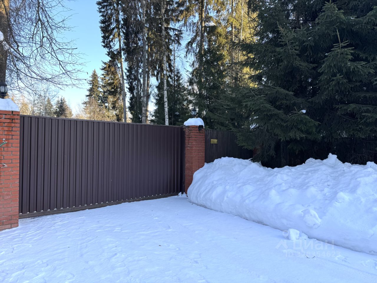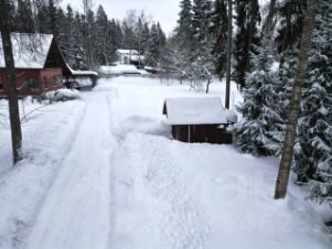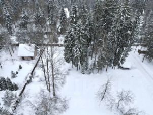 Участок правильной формы огорожен, с великолепными соснами и елями.