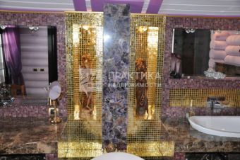 Дорогая качественная отделка, натуральные отделочные материалы, мрамор, паркет, дорогая сантехника.
