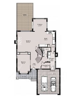 Первый этаж: прихожая, гардеробная, гараж, техническое помещение, санузел, гостиная-столовая, кухня, кладовая, терраса;
