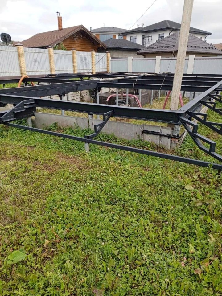 На участке: Свайный фундамент на двутавровом ростверке под строительство дома - оцинкованные сваи (250 м.кв. с учётом гаража и террасы), фундамент для беседки.