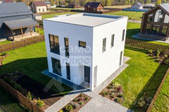 Современная архитектура в стиле "куб" с плоской кровлей и большими окнами.