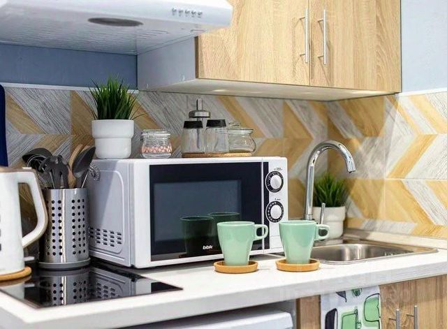 Кухня: собственная (раковина, посуда, электрическая плита, свч-печь, холодильник, стиральная машинка, чайник, вытяжка); обеденный стол;