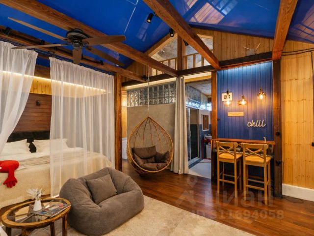 В основном помещении кровать-подиум 200х200, чилл-зона, туалетная и душевая комнаты, раковина, стиральная машина, сауна; мансарде матрас 200х200