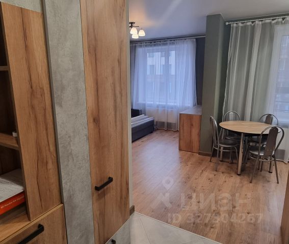 Кухня-гостиная объединяет столовую зону, место для отдыха с диваном и телевизором, а также отдельное рабочее пространство. В прихожей предусмотрен шкаф и зеркало. Ванная комната оформлена в мягких трендовых оттенках, оборудована тропическим душем и зеркалом с подсветкой.