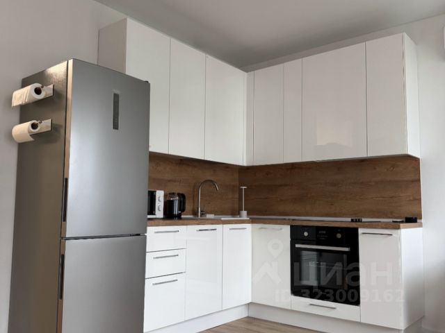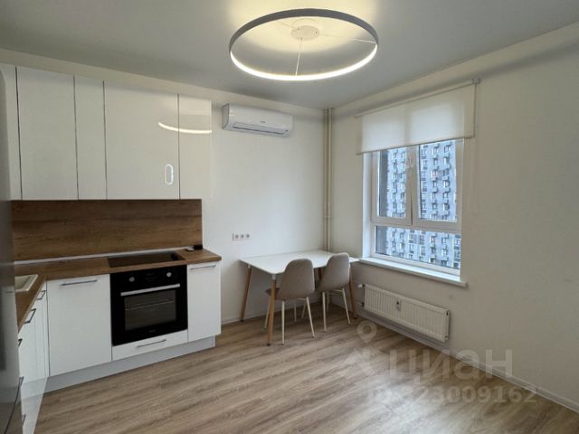 На кухне-гостиной: гарнитур, варочная панель, духовой шкаф, посудомоечная машина, микроволновая печь, холодильник, большой обеденный стол со стульями, кондиционер.