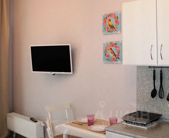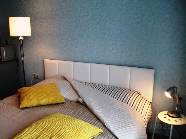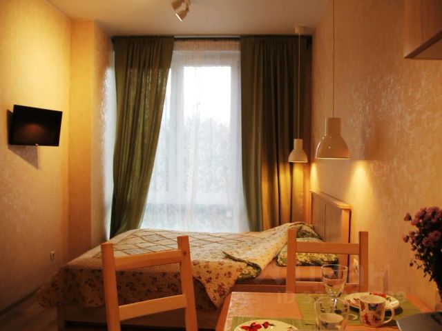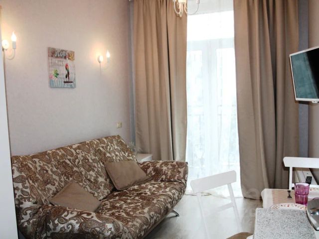 Студия квартира RoomOnDay в ЖК Квартал 9/18, Мытищи с одной двухспальной кроватью и одноместным диваном.