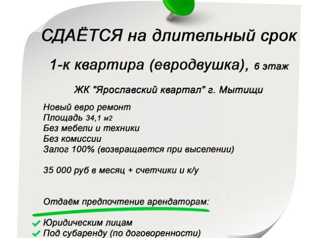ОТ СОБСТВЕННИКА С декабря 2025 года БЕЗ МЕБЕЛИ И ТЕХНИКИ СДАЁТСЯ на длительный срок 1-к квартира (евродвушка), 6 этаж ЖК "Ярославский квартал" г. Мытищи Новый евро ремонт Площадь 34,1 м2 Без мебели и техники Без комиссии Залог 100% (возвращается при выселении) 35 000 руб в месяц + счетчики и к/у До МКАДа 5 км До автобусной остановки на Москву 3 минуты (300 м) пешком До ж\д станции Мытищи 15 минут пешком Рядом парк Лосиный остров Рядом город Королев Отдаём предпочтение арендаторам: Юридическим лицам Под субаренду (по договоренности) Без животных Некурящим Детский сад у ЖК "Ярославский квартал" появится в начале 2026 года с вместимостью 255 мест. Школа - в третьем квартале 2027 года. Трехэтажное здание будет рассчитано на 550 мест. Квартира в Мытищах.