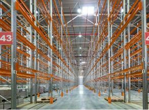 Есть двое ворот в ноль, место для погрузки-разгрузки фур. Установлены металлические стеллажи.