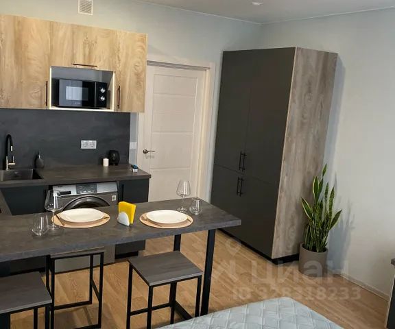 Кухня: собственная (раковина, посуда, электрическая плита, СВЧ-печь, холодильник, стиральная машинка, чайник, вытяжка); Обеденный стол;